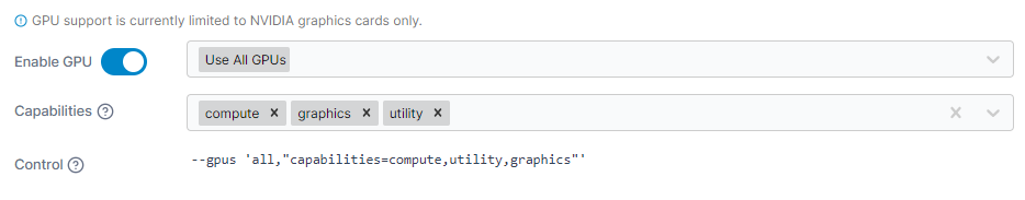 Toggle this option on to enable GPU access for the container.