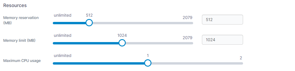 Here you can configure resource limits for your container. You can use the sliders to set the value or enter a value in the fields.