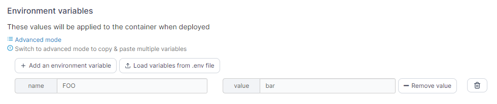Use this section to add or edit environment variables made available in the container. Click Add an environment variable to create a new variable, or edit an existing variable with the fields provided. You can also click Load variables from .env file to import an existing .env file with your variables. To remove a variable, click the trash can icon to the right of the variable to remove.