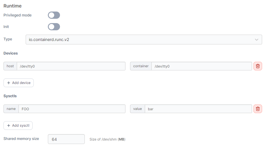 Use this option to specify sysctls to make available within the container. Click add sysctl to add a new sysctl, and set the name and value for your sysctl as required.