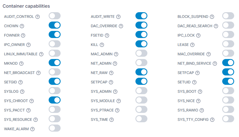 In this section you can configure the individual capabilities for your container. For more information refer to the Docker documentation.