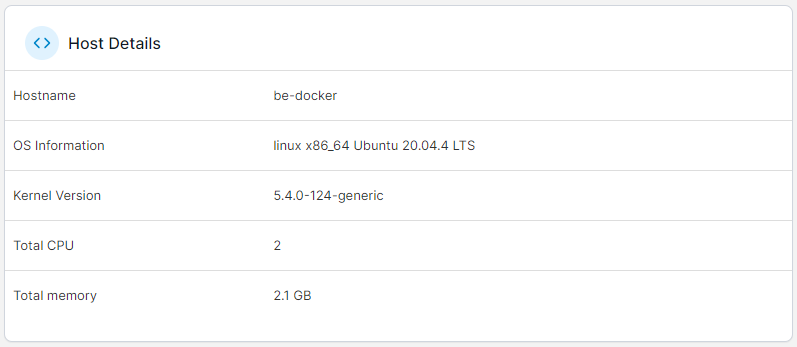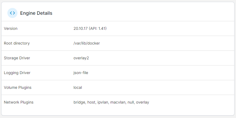 Learn more about the Docker or Podman engine running on your environment, including the Docker/Podman version, the root directory, storage and logging drivers and available volume and network plugins.