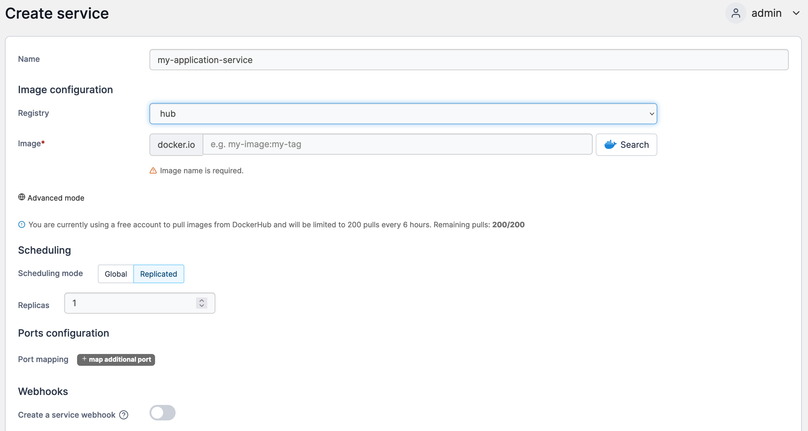 | Registry                 | Select the registry that contains the image you wish to use for the service.                                                                                                                                                     |