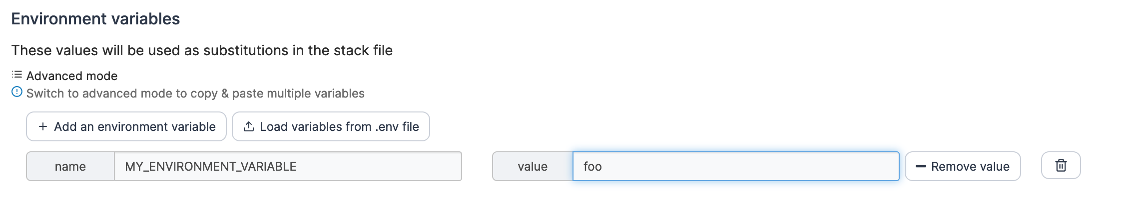 As an optional step, enter any environment variables. You can use these to define values in your compose file that would vary between deployments (for example, hostnames, database names, etc).