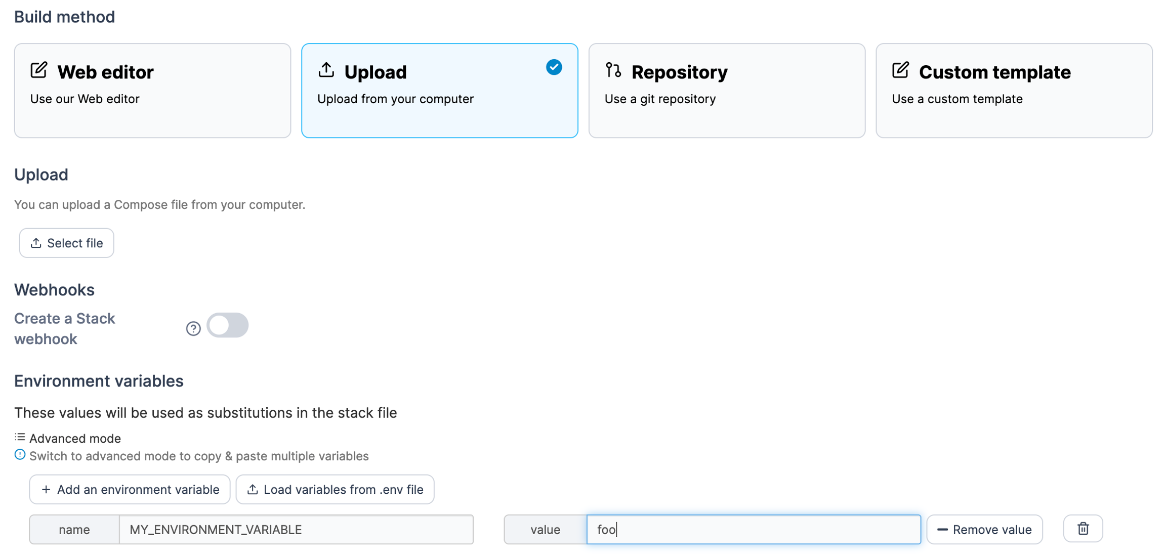 As an optional step, you can also use the web editor to define environment variables. You can use these to define values in your compose file that would vary between deployments (for example, hostnames, database names, etc).