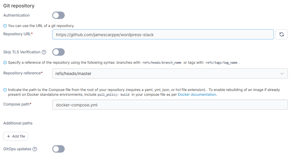 Portainer supports automatically updating your stacks deployed from Git repositories. To enable this, toggle on GitOps updates and configure your settings.