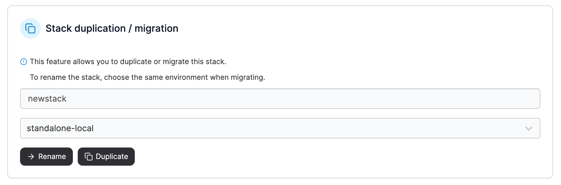 In the Stack duplication / migration section, give the stack a new descriptive name and select the environment that the stack is currently on. When you're ready, click Rename.