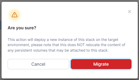 Migrating does not relocate the content of any persistent volumes that may be attached to the stack. Acknowledge this warning and confirm the migration by clicking Migrate.