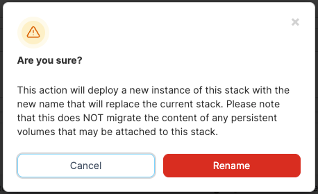 Renaming creates a new stack instance and does not transfer the content of any persistent volumes that may be attached to the stack. Acknowledge this warning and confirm the migration by clicking Rename.