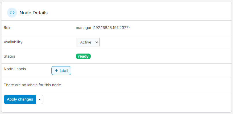 Here you'll find details about the node's configuration as part of the cluster. You can view the role, set the availability status of the node, view the current status and apply labels to the node.