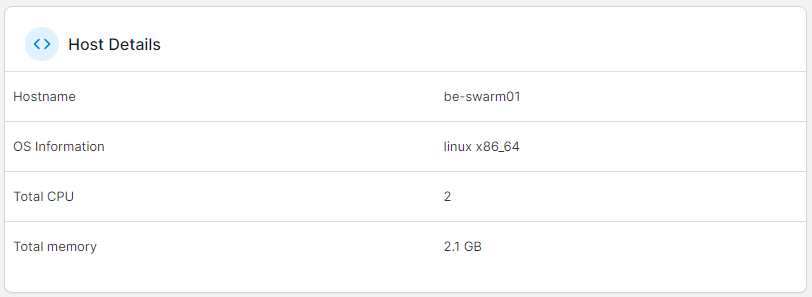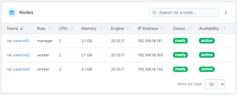This page provides information about the Docker Swarm cluster for the selected environment. The page is split into the following sections: Cluster status and Nodes, with clicking a node name taking you to the Node overview for that node.