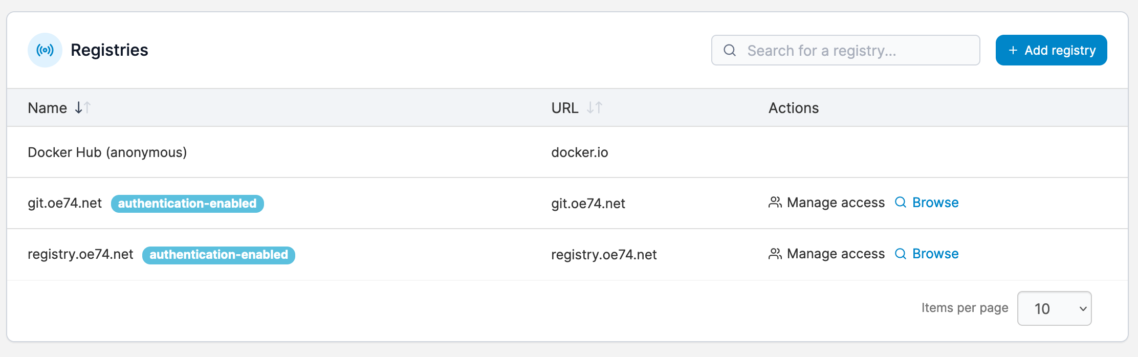 Registries lets you manage access to each of the registries that are currently available.
