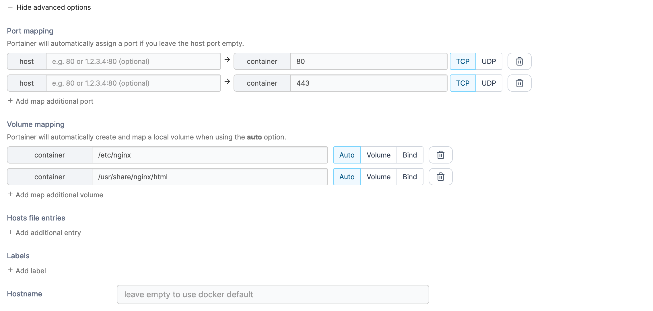 You can also make changes to container settings such as port and volume mapping, host file entries, labels and the hostname by clicking Show advanced options.