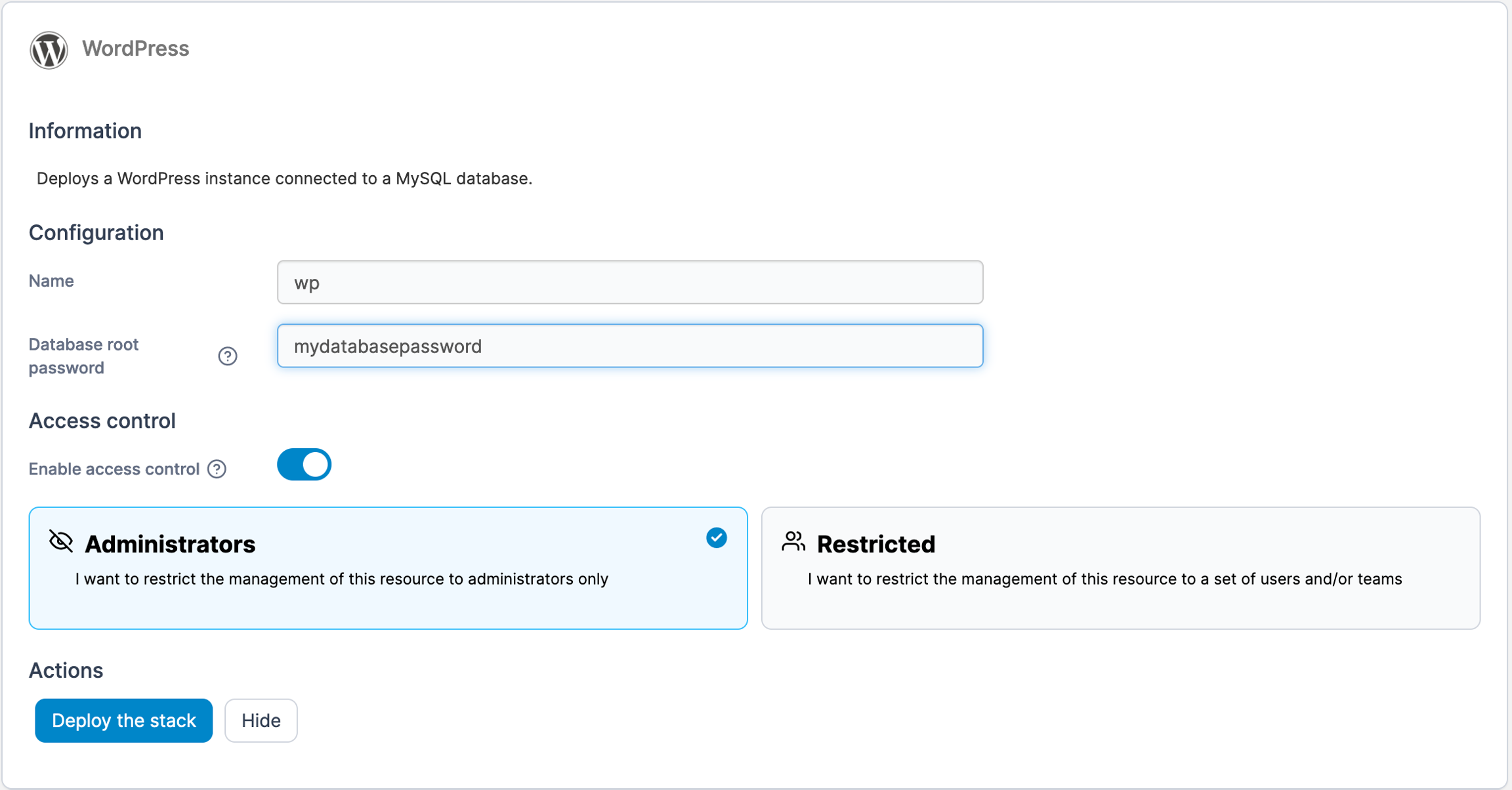 Enter a name for the stack and set any required configuration values (these will differ from template to template). Toggle Enable access control on or off as required.