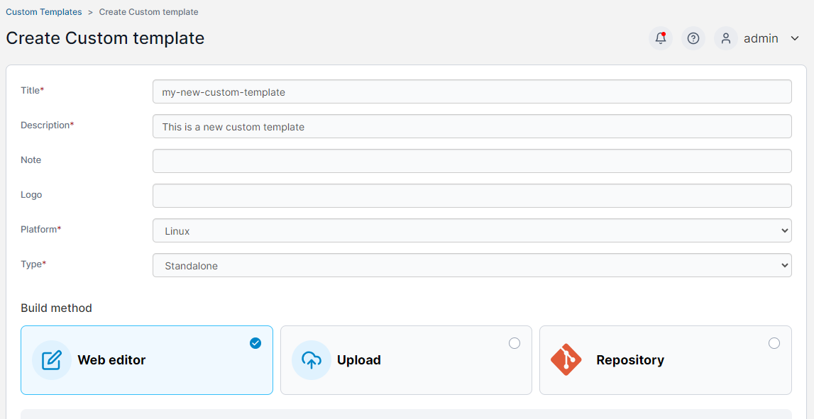 To create a new custom template, click the **Add Custom Template** button and fill out the resulting form and stack details.