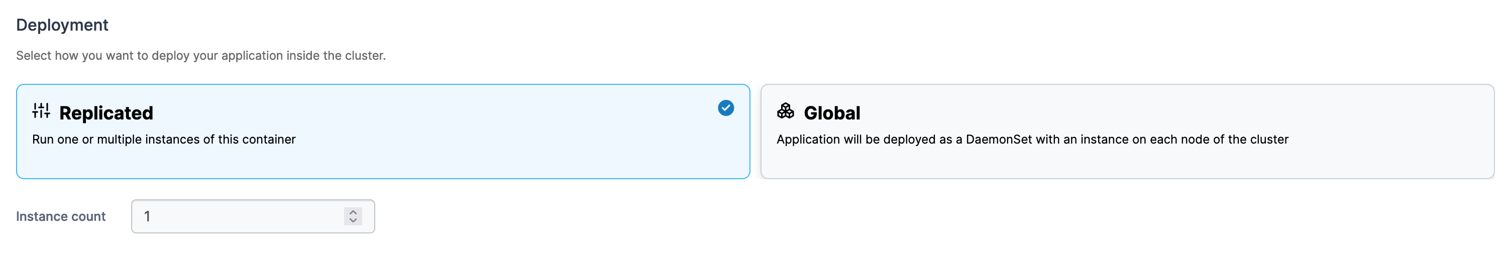 This section allows you to choose how you want to deploy the application inside the cluster. Options are: