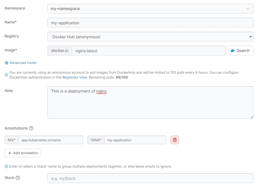 Portainer can automatically bundle multiple applications inside a stack. You can either enter the name of a new stack, select an existing stack from the list, or leave empty to use the application name.