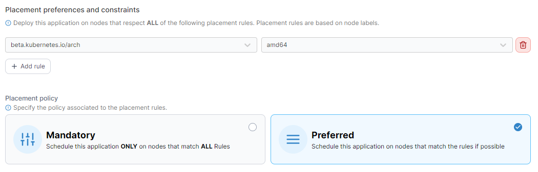 Here you can define which placement rules must be followed by the nodes where the application is deployed to. Placement rules are based on node labels. To create a new rule, click add rule.