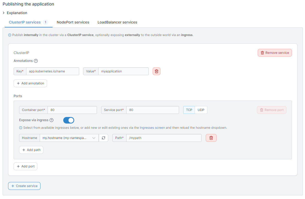 Here you can create the necessary services to expose your application. Select the type of service (ClusterIP, NodePort, or LoadBalancer) from the tabs and click Create service. You can then configure each service as required, including adding annotations to the services if required.