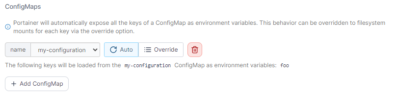 Select any ConfigMaps you have previously created to make them available to the application. Portainer will automatically expose all the keys of a ConfigMap as environment variables. This behavior can be overridden to filesystem mounts for each key via the Override button.