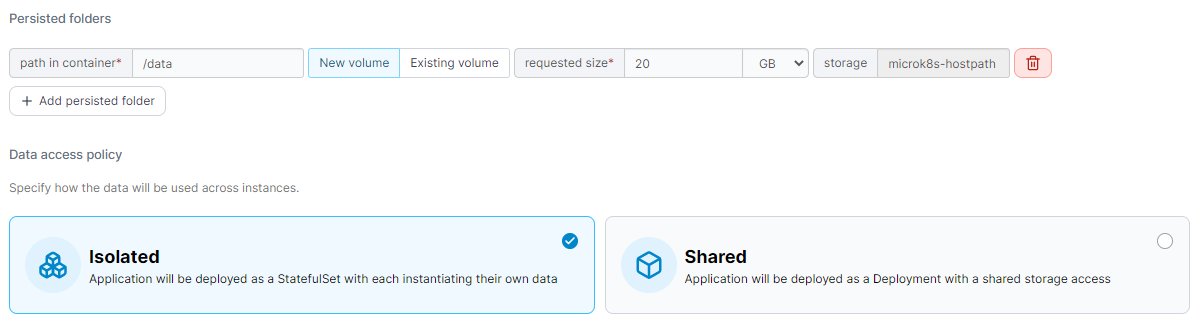 Define any persistent folders within the application and whether these are new or existing volumes, as well as the size of the volume and storage location.