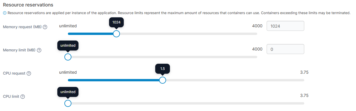 In this section you can define the amount of memory and CPU requested by the application as well as the upper limits for memory and CPU that the application is permitted to use. If the namespace you have selected has resource quotas set, you must define at least the request values.