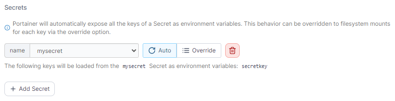 Select any secrets you have previously created to make them available to the application. Portainer will automatically expose all the keys of a secret as environment variables. This behavior can be overridden to filesystem mounts for each key via the Override button.