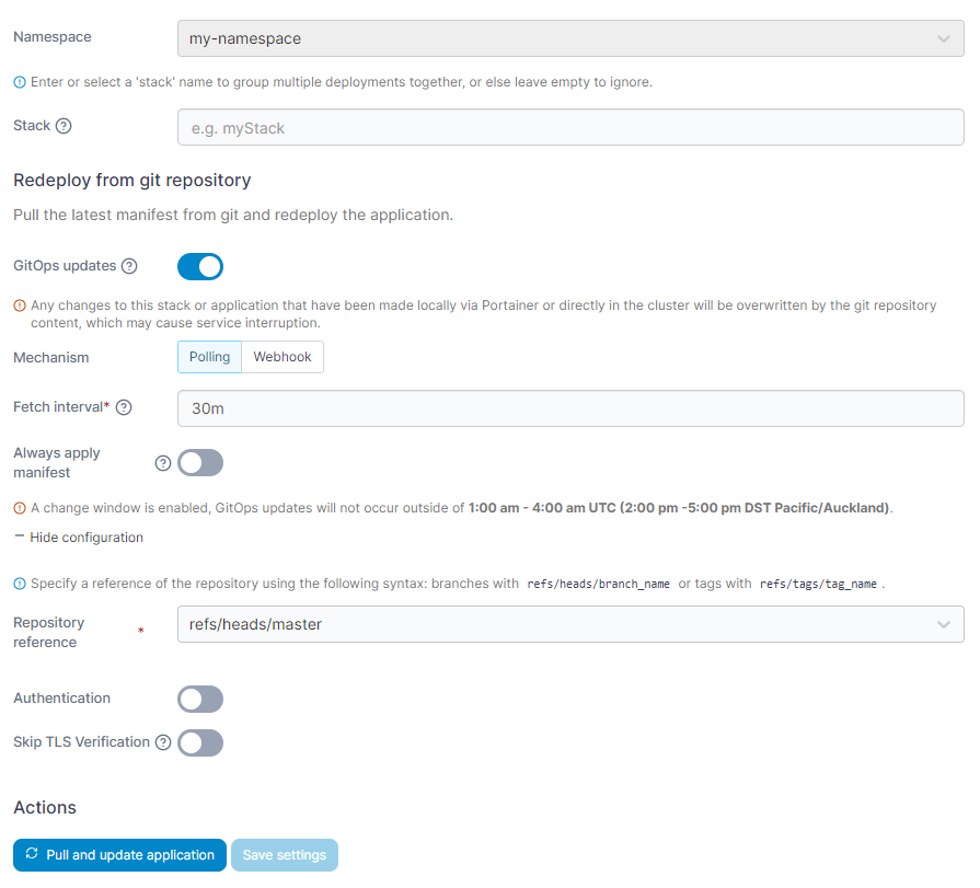 You can reconfigure GitOps updates, the repository reference and authentication here if needed. If a change window is enabled, information on it will appear here as well.