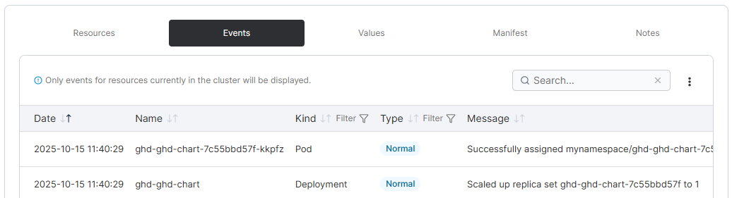 The Events tab lists the events related to the deployment of this application. Events listed here are relative to the events TTL setting on the underlying Kubernetes environment, so will disappear after some time.