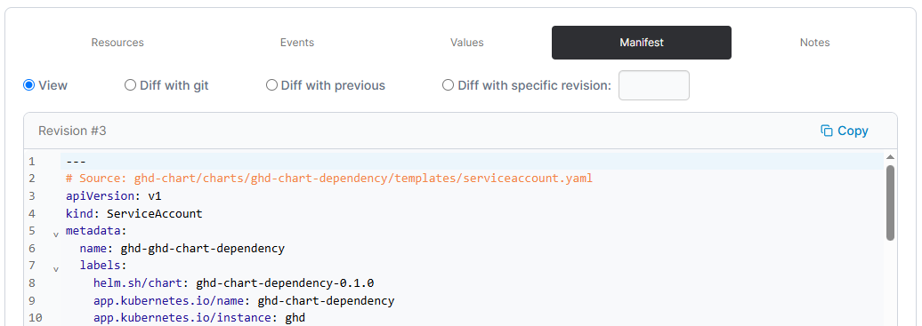 The Manifest tab displays the raw manifest used to deploy the Helm chart. By default the View option is selected which shows the currently deployed manifest, but choosing Diff with previous or Diff with specific revision (and specifying a revision) lets you compare the currently deployed manifest with that of a previous revision.