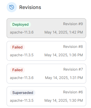 On the right side of the page you will also see a list of revisions for your Helm deployment.