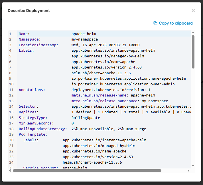 Click on the name of select resource types (such as Deployments and Pods) to view details of that specific resource. Clicking the Describe link for a resource will display a raw description of the resource in a popup window.
