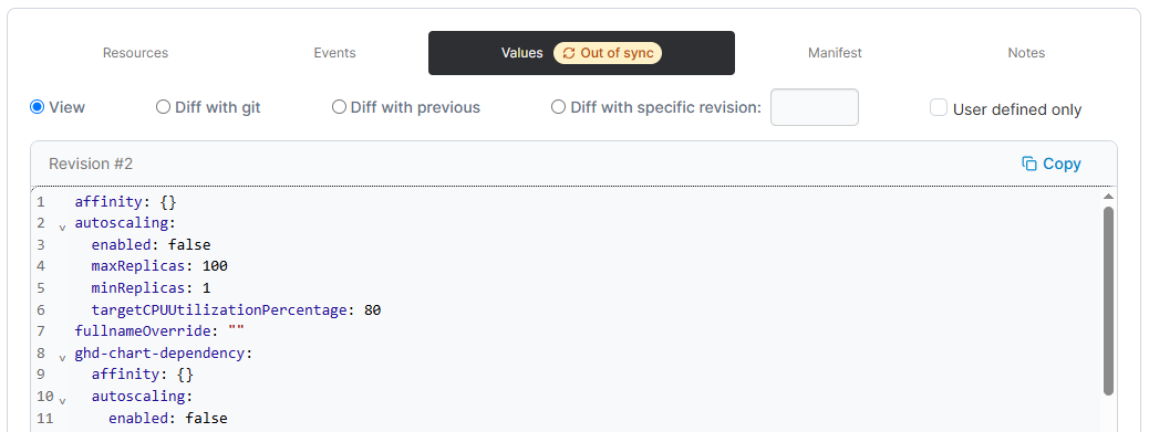 The Values tab shows the raw values set on the deployment. By default the View option is selected which shows the currently deployed values, but choosing Diff with previous or Diff with specific revision (and specifying a revision) lets you compare the currently deployed values with those of a previous revision. You can check the User defined only option to display only those options explicitly specified by the chart, or untick it to show all values including globally set options.