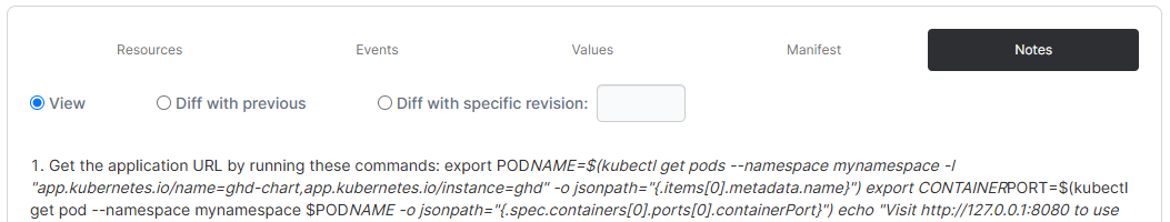 The Notes tab displays any notes that were attached to the Helm chart when it was deployed. By default the View option is selected which shows the currently deployed notes, but choosing Diff with previous or Diff with specific revision (and specifying a revision) lets you compare the currently deployed notes with those of a previous revision.