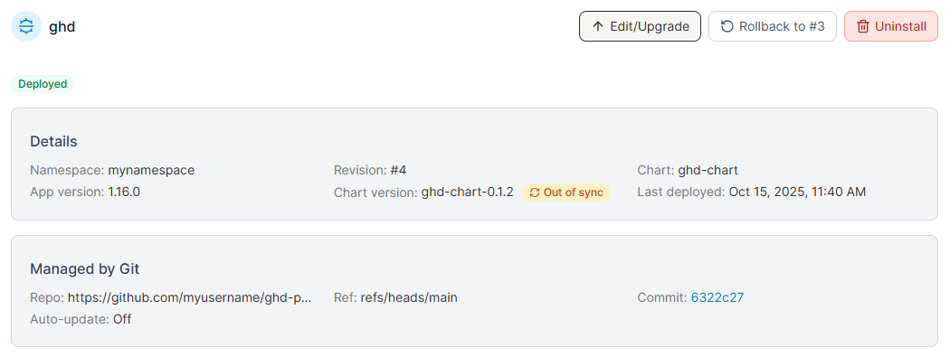 If your Helm application was deployed using a Git repository, you will also see details of the repo, ref, the commit hash, and if auto-update is on or off. If there is a new chart version available in the Git repo, an Out of sync label will be shown. Click on this label to sync the deployment with the repository.