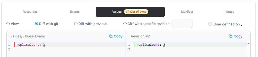 If your Helm application was deployed from Git, the Values tab will display an Out of sync tag when the user-defined values in the Git source do not match those of the current release.