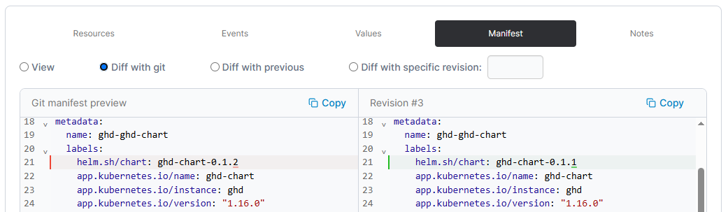 If your Helm application was deployed from Git, you will also see a Diff with git option. This lets you compare the manifest in the deployed release with the latest manifest from the Git repository.