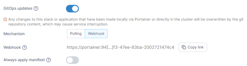 Enable GitOps updates if it is not already enabled and select Webhook as the Mechanism. When the URL appears, click Copy link. This is the URL used to trigger the webhook.