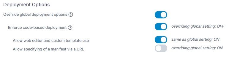 Allow web editor and custom template use | When code-based deployment is enforced, enable this to allow the use of the web editor and custom templates when deploying an application. |