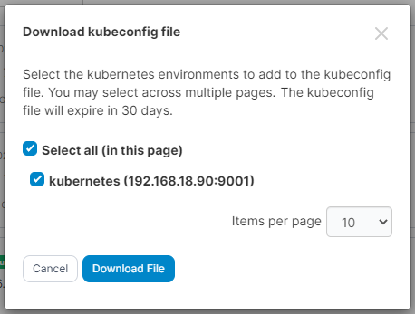 You will be asked to select the Kubernetes environments that you would like in your kubeconfig file. If you have configured a kubeconfig expiry value, this will also be shown.