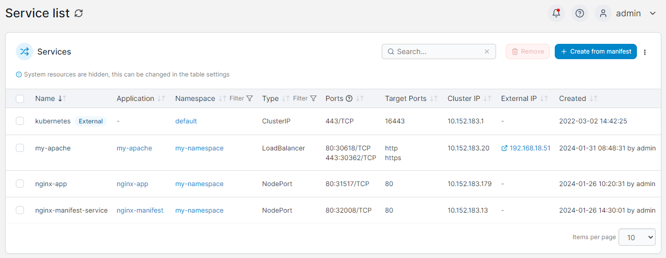 The Services page lists the services within your cluster, and provides detail on each service. To view the list of services, expand Networking and select Services from the left hand menu.