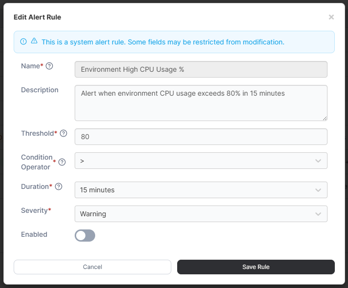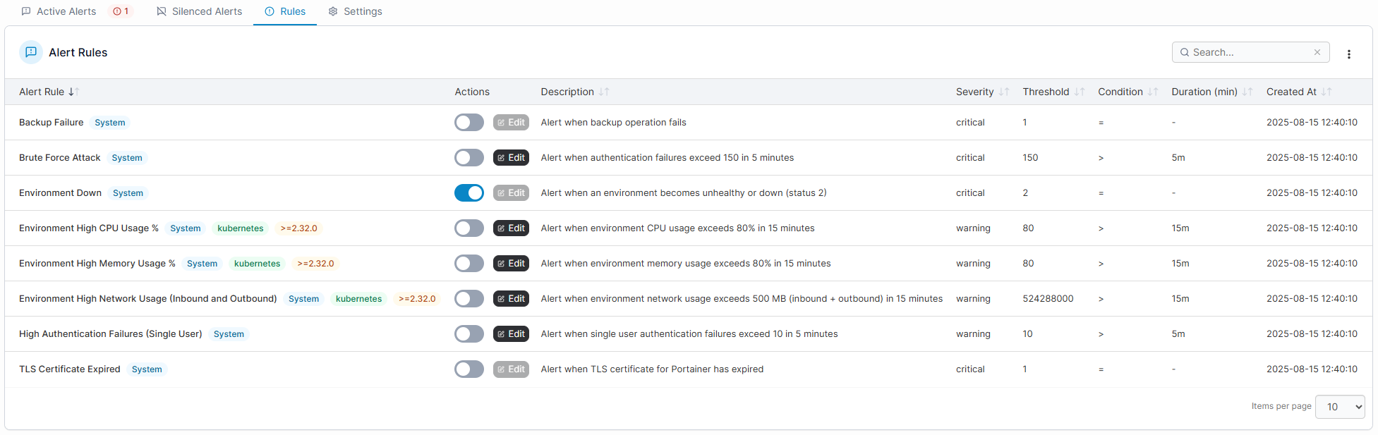 Here you can enable the rule using the toggle, and where relevant click Edit to customize the rule settings. Rules cannot be enabled if no alert manager instances are enabled.