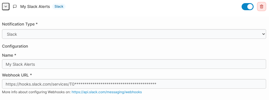 Enter the webhook URL for your Slack integration. You can learn more about how to configure this in the Slack API documentation.