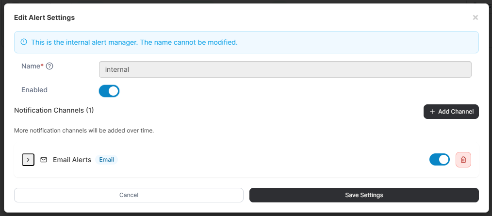 To edit an alert manager instance, click the Edit button for the instance in the Actions column. Here you can see the Name of the instance and enable or disable it through the toggle. You will also see any notification channels you have added listed here.