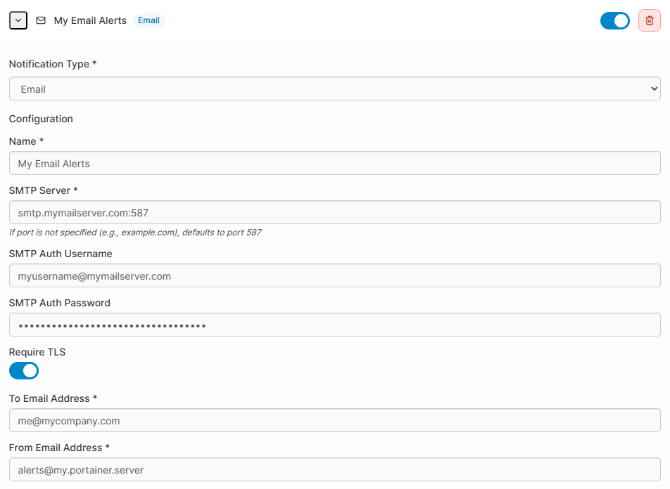On the Alerting page you can configure alerts for events related to your environments and for Portainer itself. Alerts will display on the Alerting page and notifications can be sent via Slack or Microsoft Teams integration, via email, or by triggering a webhook.