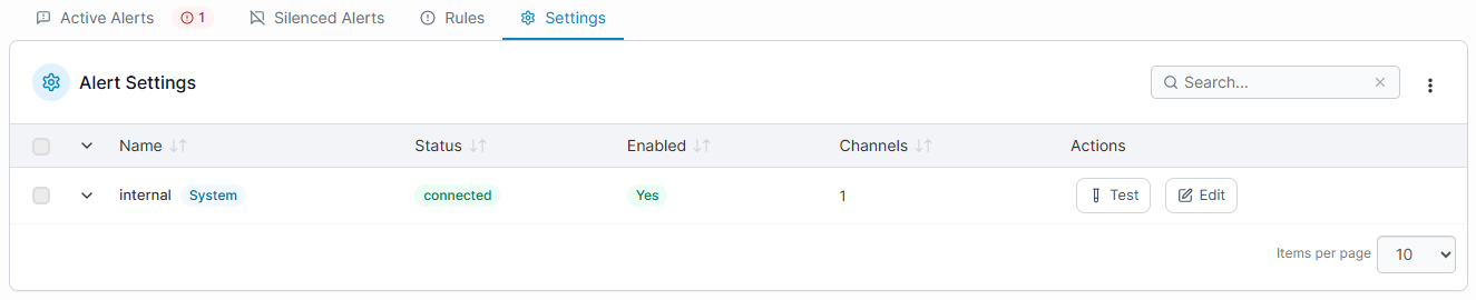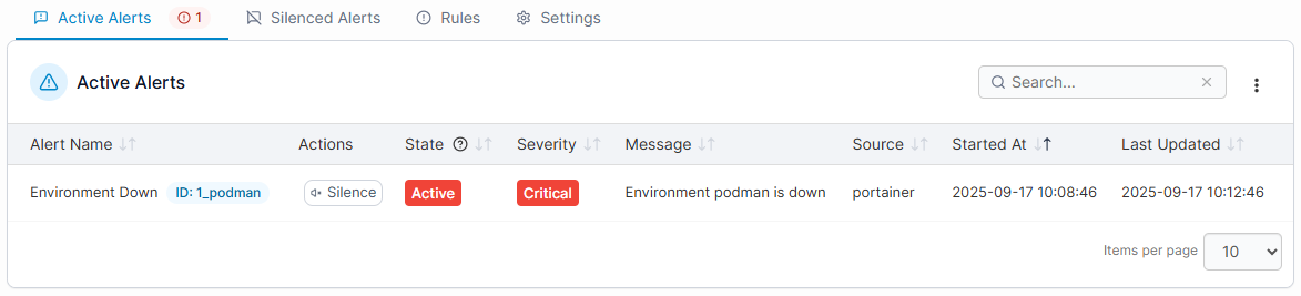 This tab lists any silenced alerts. Silenced alerts are active alerts that have been temporarily silenced and will not notify.