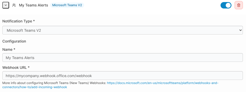 Enter the webhook URL for your Microsoft Teams integration. You can learn more about configuring Microsoft Teams webhooks in the Microsoft documentation.